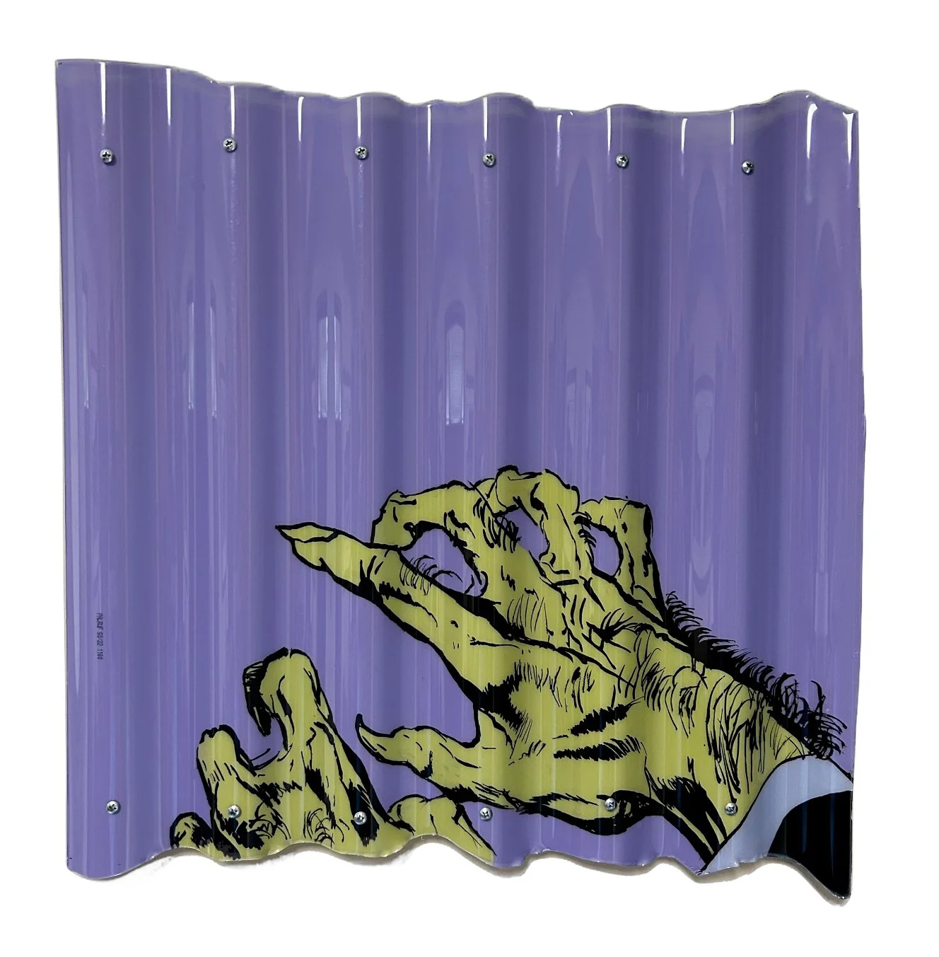 Rôder / 2023 / Mark George (Jacksonville, Florida) / Acrylic and aerosol on polyvinyl chloride panel with metal fasteners / 20 x 20 inches / $1750 / "A once successful Cajun businessman, who now out of complete boredom has taken residence on the bayou with creatures of his kind."