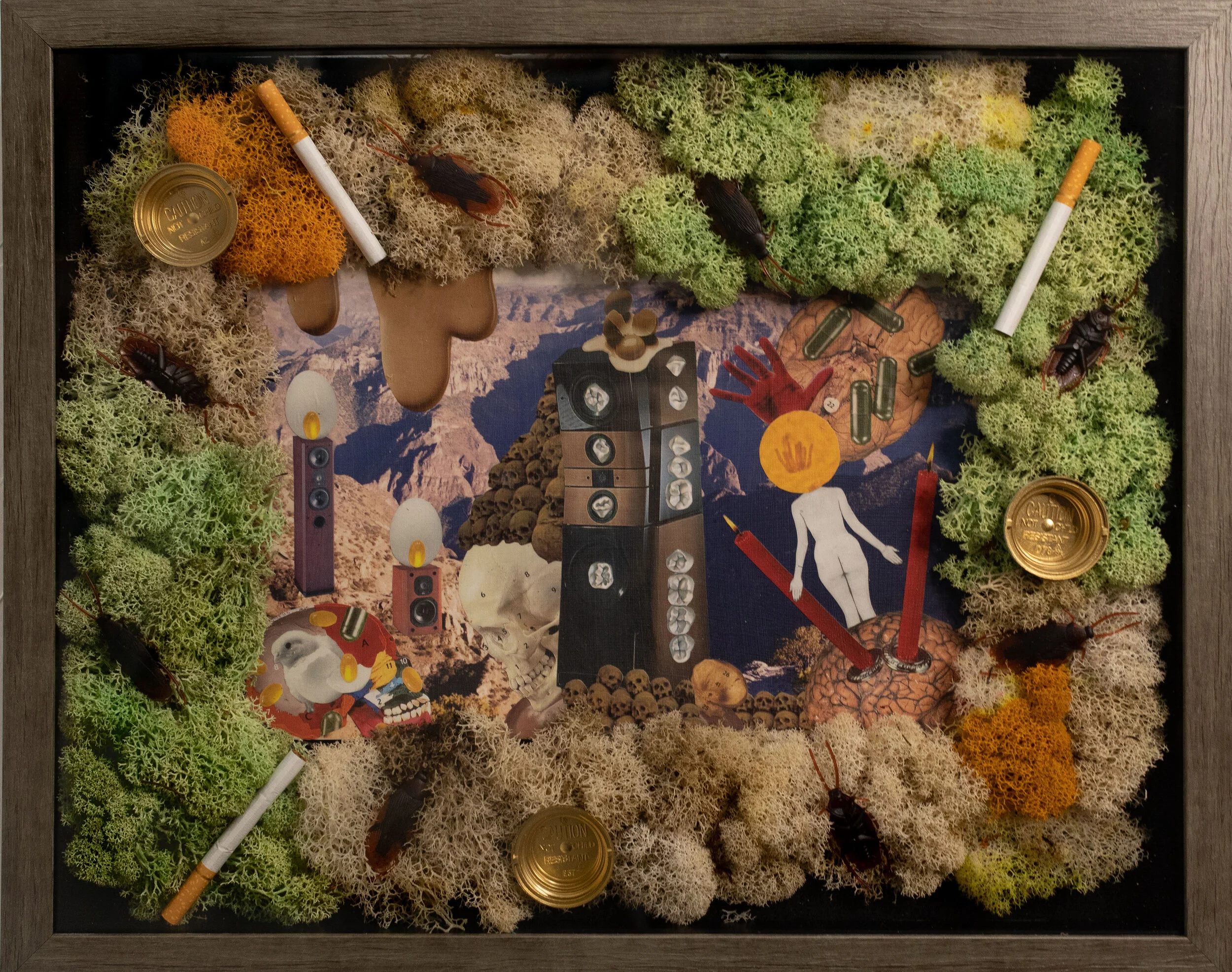 Insidious Dementia and Other Bulletproof Maladies / 2021 / Melody Jean Moulton / Paper collage on found photo, moss, cigarettes, rubber cockroaches, Rx bottle lids, spray paint / 19 x 15 inches / $250 / SOLD