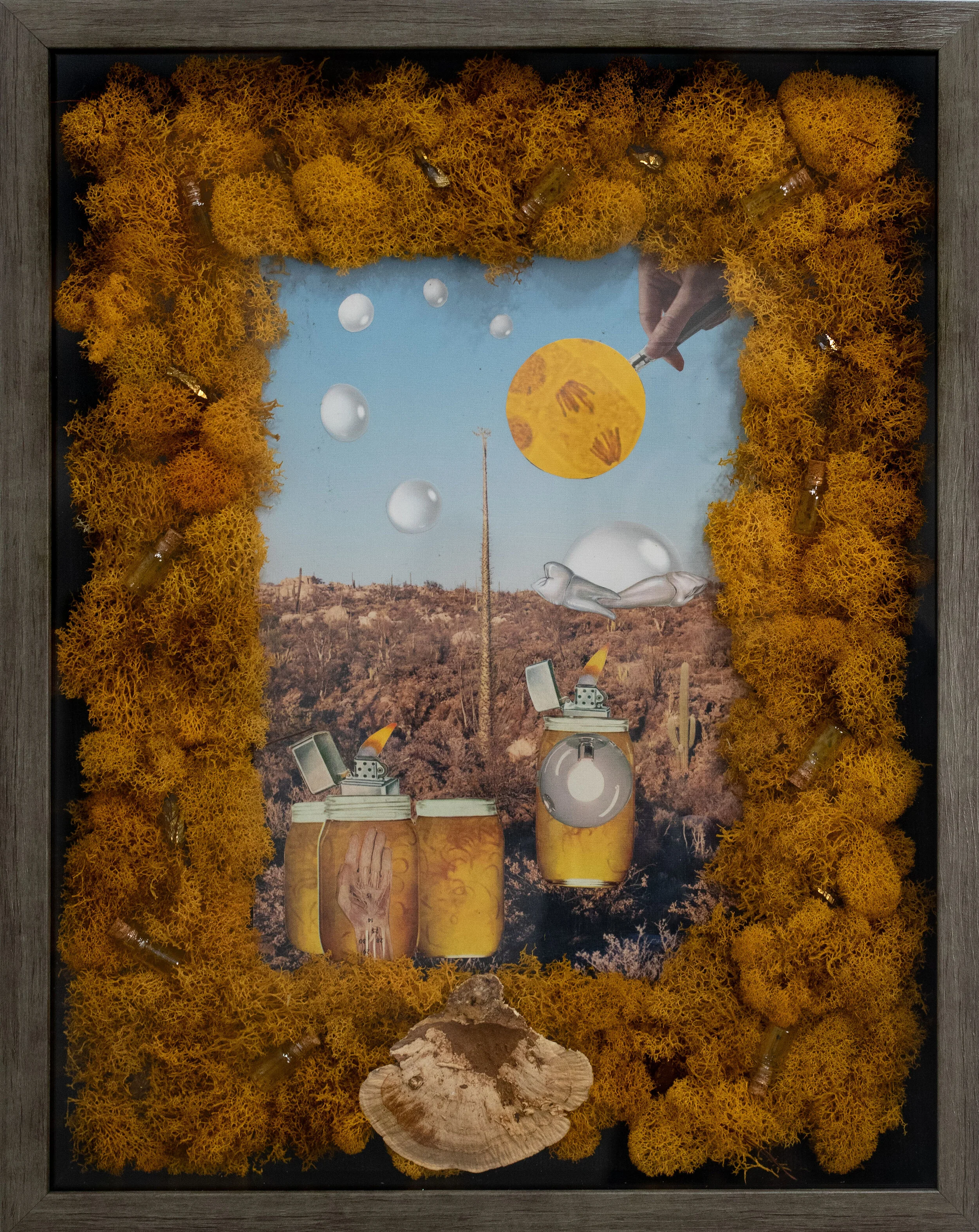 The Fourth Of July / 2021 / Melody Jean Moulton / Paper collage on found photo, moss, glass vials, glow-in-the-dark scorpion / 15 x 19 inches / $250 / SOLD