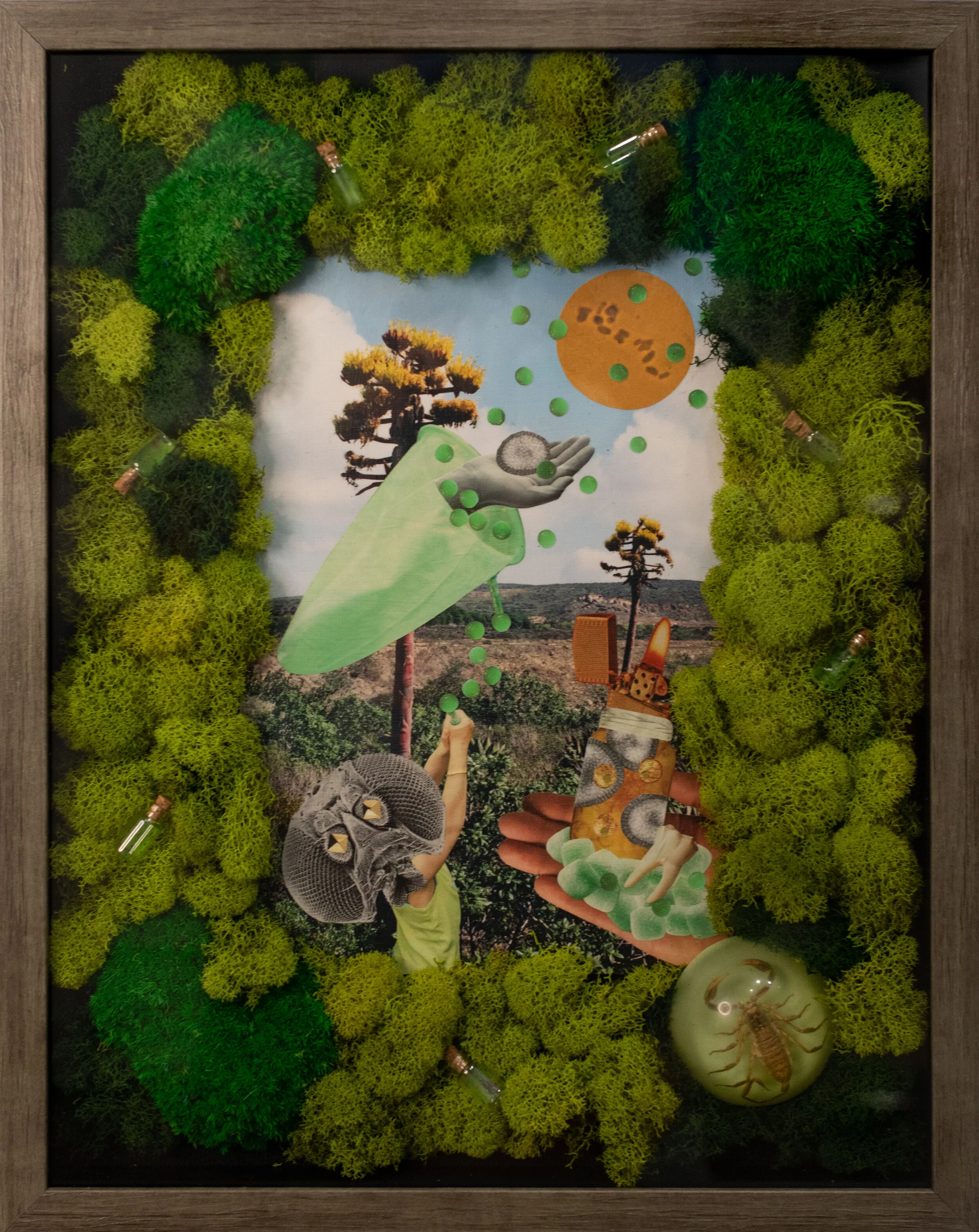 Trust Us, It's Good For You / 2021 / Melody Jean Moulton / Paper collage on found photo, moss, mushrooms, palo santo, dead poppies / 19 x 15 inches / $250 / SOLD