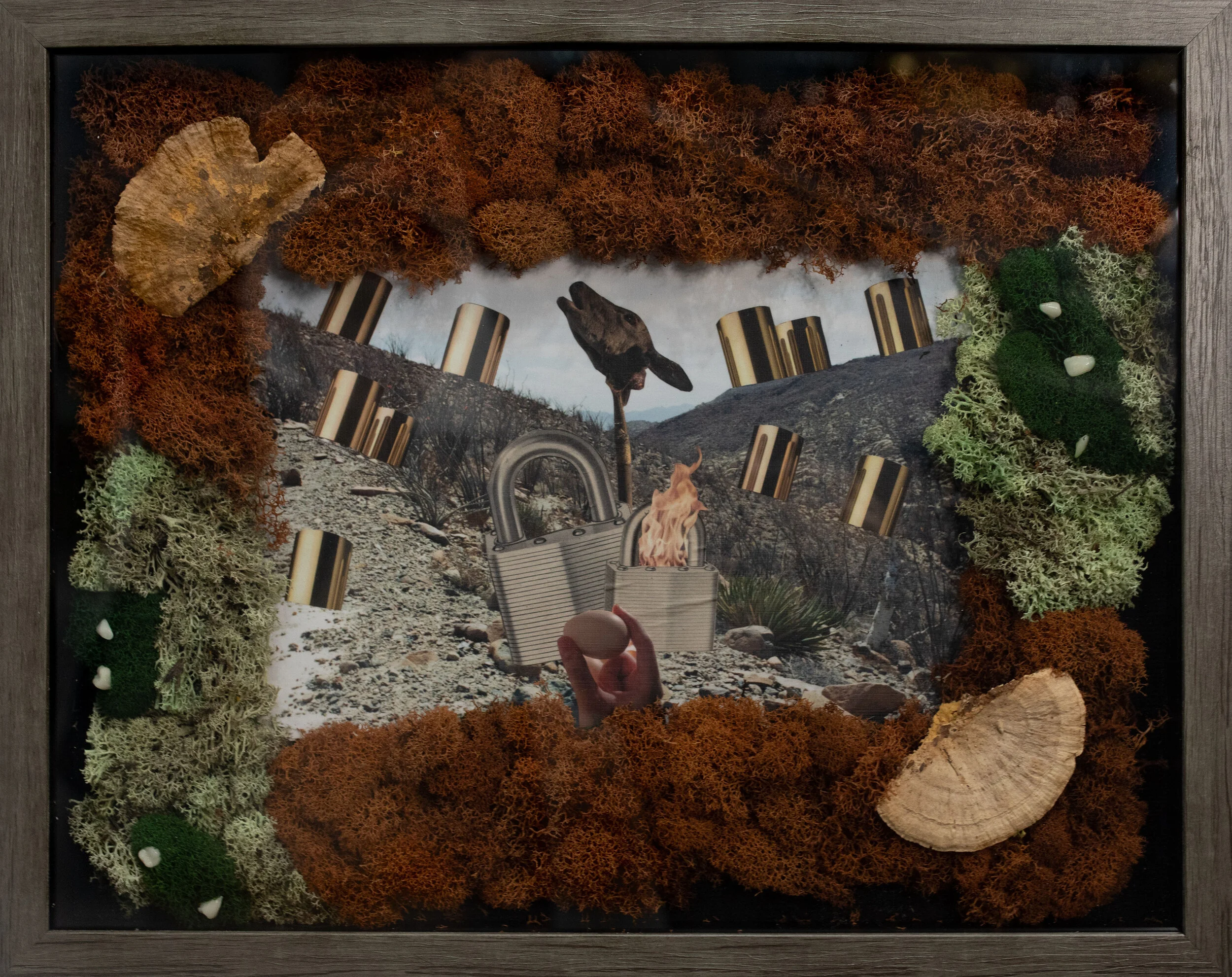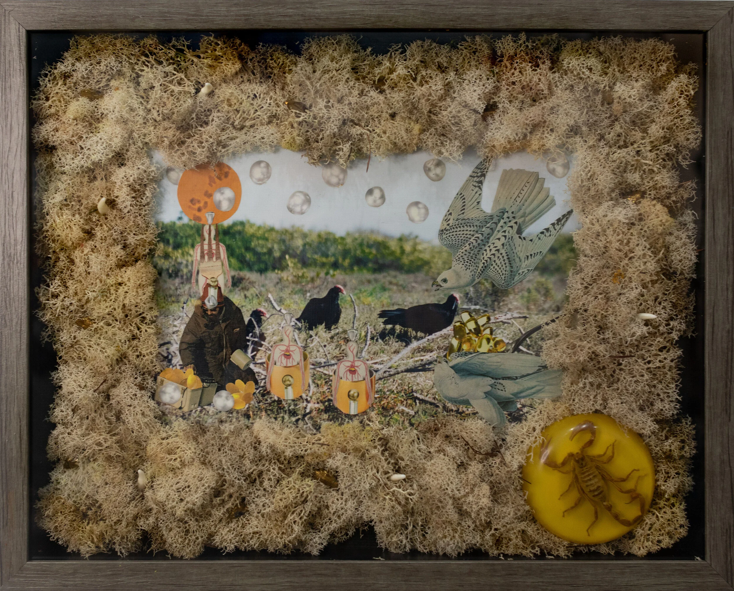You Can't Have My Land Mine / 2021 / Melody Jean Moulton / Paper collage on found photo, moss, coyote teeth, hematite, scorpion / 19 x 15 inches / $250