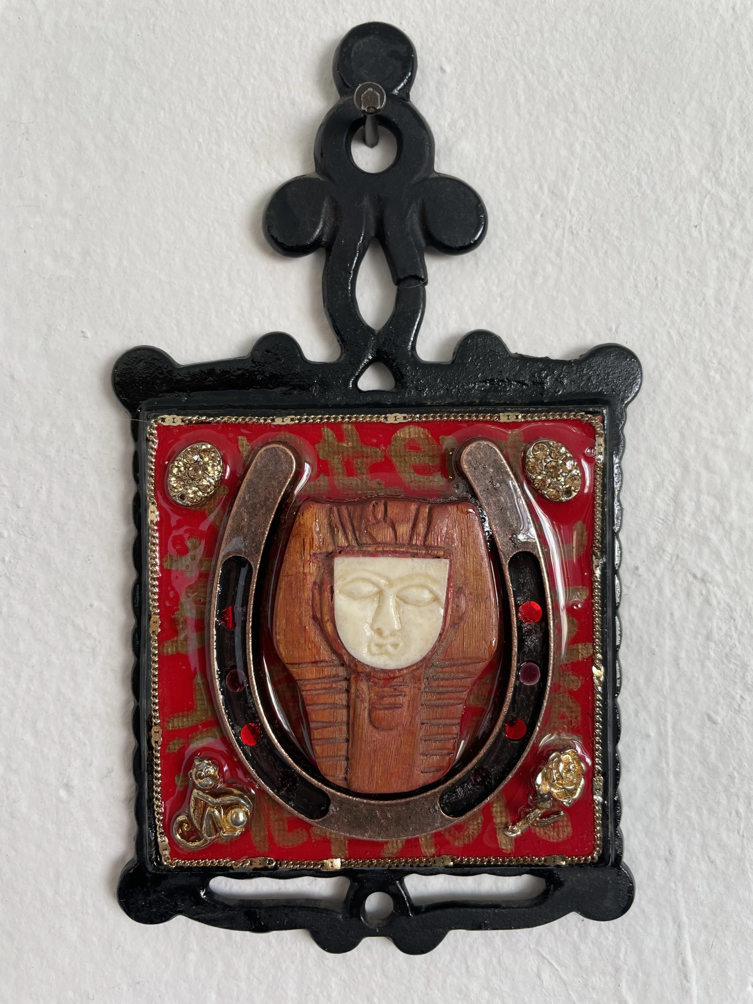 “After a Near Death Experience at age 2 (in which I received the Last Rites but lost my hearing), I now live on Bonus Time. As a Lip-Reader during this Age of Masques, I compensated by becoming a better Mind-Reader. One thing I intuited during the Pandemic was a need for Beneditos, or Cabin Blessings. Each trivet is adorned with horseshoes, good-luck charms & protective amulets, then cured with earthquake-proof art resin. Within each benedito is a novena, or poem-prayer or incantation, that I wrote & culled from my diaries. May each Benedito bless your home sweet home with good luck, protection, and love.”
